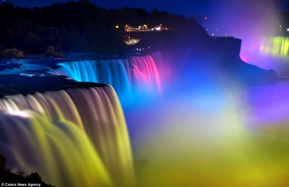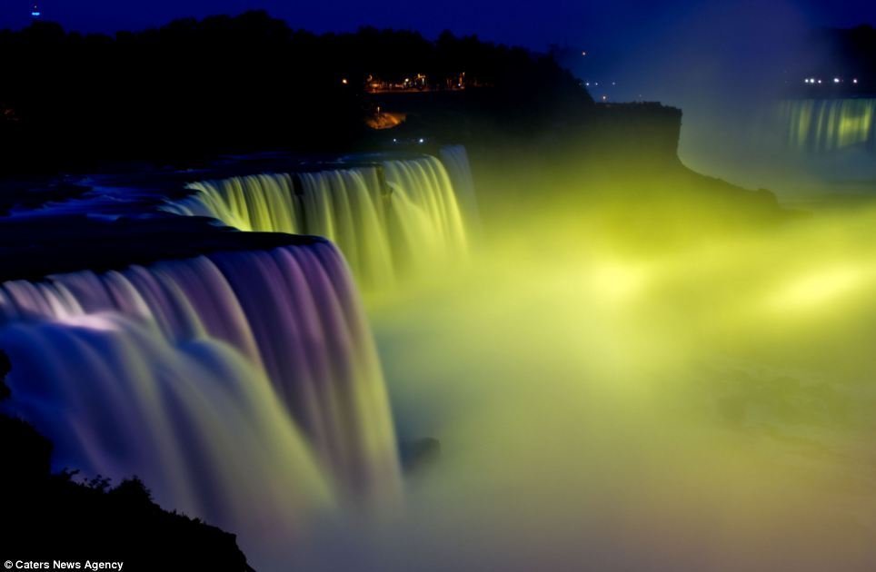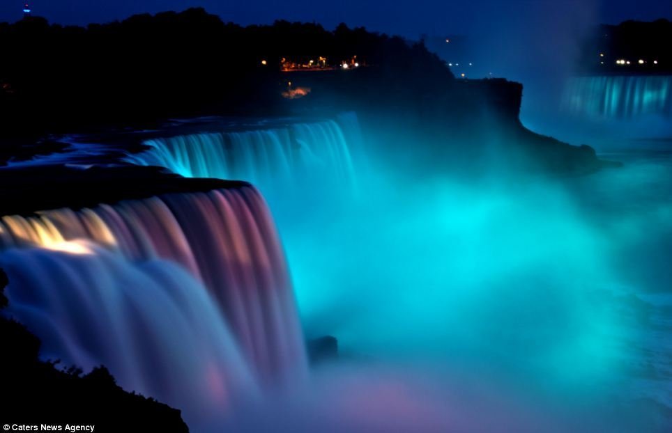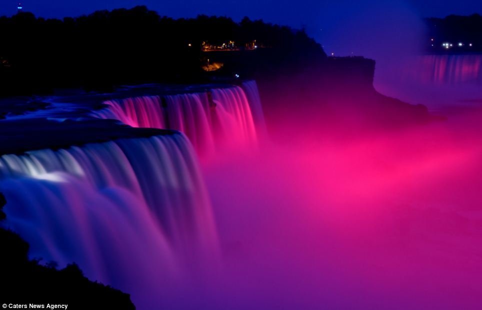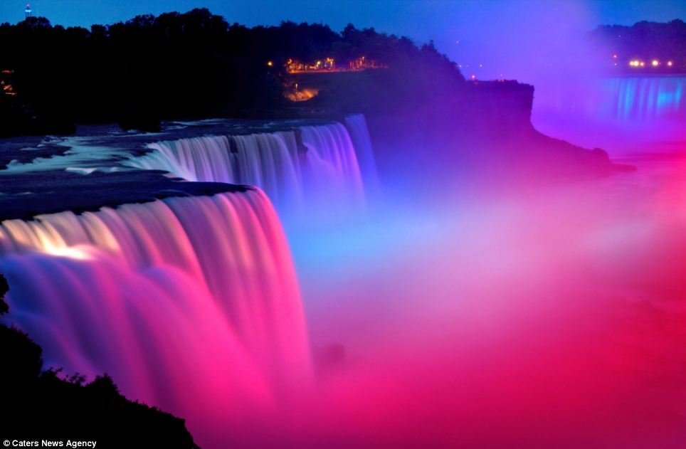 Thác nước Niagara, nằm trên đường biên giới giữa Mỹ và Canada, với những dòng thác bạc trắng xóa vào ban ngày là một địa điểm thu hút rất đông khách tham quan. Thác nước này càng trở nên kỳ ảo và rực rỡ dưới ánh sáng màu vào ban đêm.