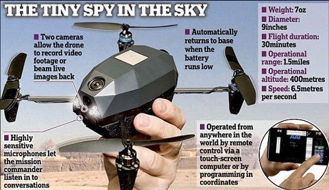 Với đường kính gần 23cm và nặng chưa đầy 2 lạng, chiếc máy bay không người lái nano này có thể bay và quần lượn suốt 30 phút hoặc tắt động cơ và đậu trên rìa tường như chim, rồi phóng to và thu chụp các hoạt động đáng ngờ tới suốt 8 tiếng đồng hồ mà không bị phát hiện.