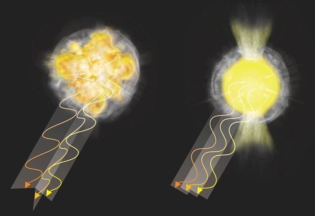 Mô hình dựng bằng công nghệ 3D (trái) cho thấy siêu tân hình có hình dáng khác hoàn toàn so với giả thuyết (ảnh phải) mà các nhà khoa học đưa ra trước đây.