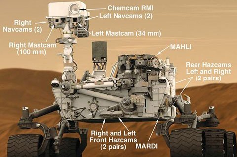 Hình mô phỏng vị trí các camera của tàu Curiosity. Hiện tại, các tài xế của tàu thám hiểm tự hành này bắt đầu một ngày làm việc của họ bằng cách nghiên cứu các hình ảnh về cảnh quan sao Hỏa được tàu truyền về Trái đất trong ngày trước đó. Ảnh: Caters News Agency |