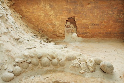 | Giữa hố là đá cuội và thạch anh xếp hình bán nguyệt. Ảnh: Nguyễn Tú/ Thanh Niên |