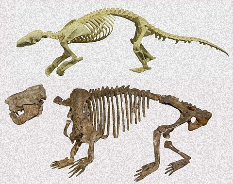 | Hóa thạch của tổ tiên loài tê tê (phía dưới) và bộ xương của loài tê tê ngày nay (phía trên). |