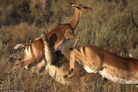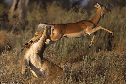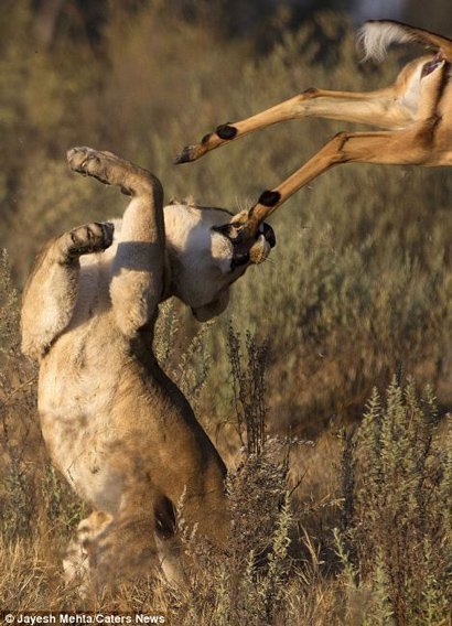 Trong chuyến du lịch tới một khu bảo tồn động vật hoang dã ở Botswana, nhiếp ảnh gia Jayesh Mehta đến từ Chicago (Mỹ), đã may mắn ghi lại được khoảnh khắc một con linh dương thoát chết ngoạn mục khỏi cuộc tấn công của một con sư tử cái.