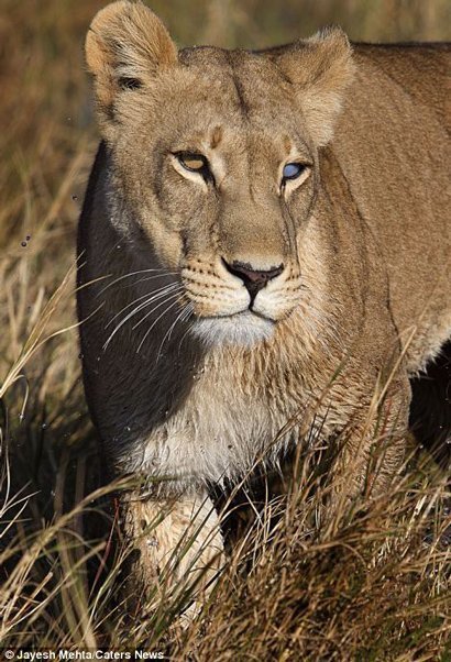 “Tôi đã phát hiện thấy rằng con sư tử cái bị mù một bên mắt do giác mạc bị mờ đục. Tôi nghĩ đó là nguyên nhân tại sao con sư tử cái không thể tấn công con mồi nhanh như những con sư tử bình thường khác”, nhiếp ảnh gia 46 tuổi cho biết.
