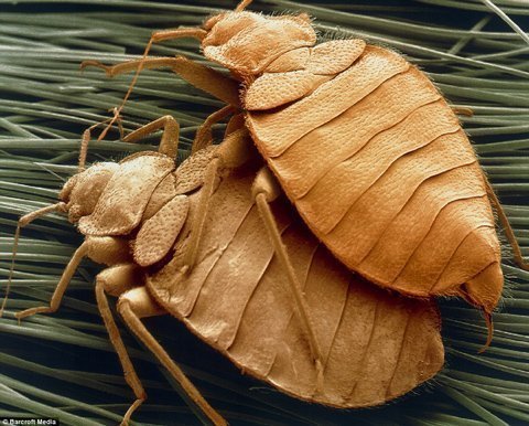 | Hai con bọ đang “ân ái”, bọ bụi và phân của chúng cùng với các lớp da chết chiếm tới một phần ba trọng lượng của chiếc gối nằm ngủ. |