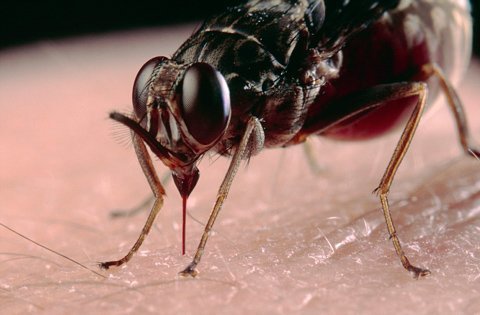 | Muỗi xêxê đang sử dụng vòi để hút máu vật chủ. Loài vật này rất phổ biến ở vùng nhiệt đới châu Phi, truyền bệnh Trypanosomiasis, còn gọi là bệnh ngủ. Bệnh ngủ châu Phi không chỉ ảnh hưởng đến con người, mà còn đến gia súc, với khoảng ba triệu động vật chết mỗi năm. |