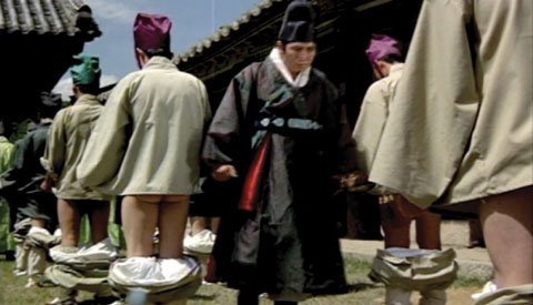 Cảnh một hoạn quan kỳ cựu đang kiểm tra những nam giới chờ đến lượt được “thiến” để được vào cung làm thái giám trong bộ phim “Hoạn quan” của đạo diễn Hàn Quốc Lee Doo Yong. Ảnh: Asia Pacific Films |