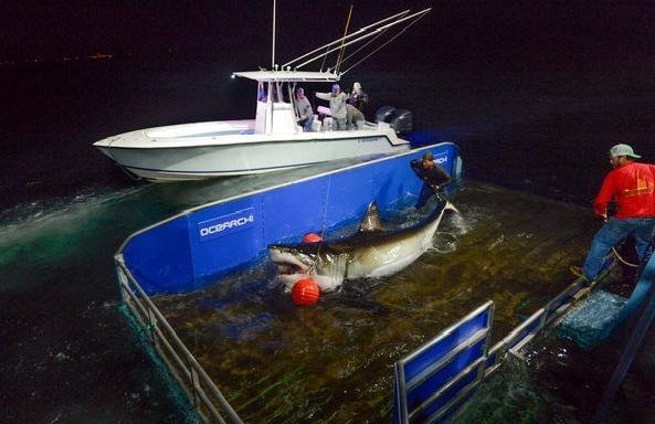 | Sau 9 ngày rong ruổi trên biển, cuối cùng “nàng” cá mập trắng đầu tiên nặng hơn 1 tấn đã bị đánh bắt sống hôm 13/9 |