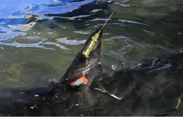 | Thẻ điện tử có chức năng theo dõi qua vệ tinh được gắn chặt vào vây lưng của cá mập trắng. Sau đó, các nhà khoa học sẽ thu thập các dữ liệu về các hành vi của “sát thủ đại dương” từ vệ tinh. |