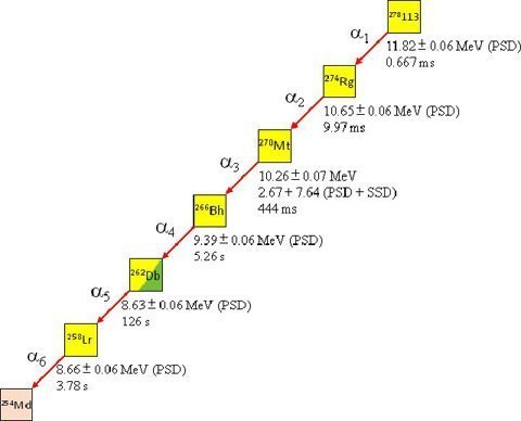 Trong đó, 5 nhóm alpha đã biết trước từ phân rã của các hạt nhân Rg274, Mt270, Bh266, Db262 và Lr258, riêng nhóm alpha đầu chưa biết được xem là phát ra từ hạt nhân mới có nguyên tử số 113 và số khối lượng 278.