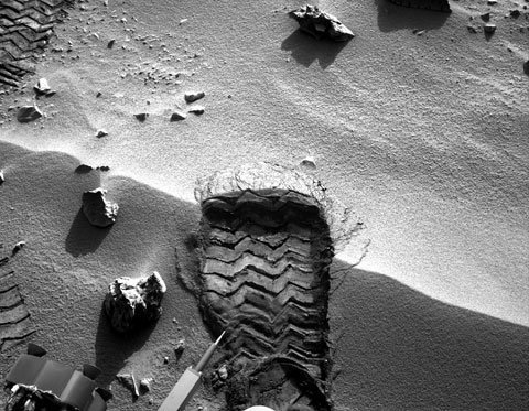 "Dấu chân" đầu tiên in hằn trên sao Hỏa thực chất là vết lốp xe của tàu thăm dò Curiosity. Ảnh: NASA |
