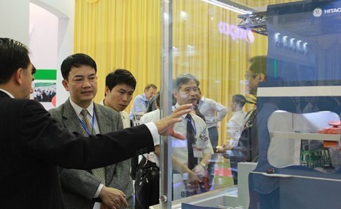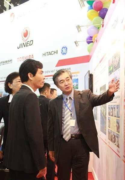 | Ông Trần Chí Thành, Viện trưởng Viện Năng lượng nguyên tử Việt Nam đang tham quan gian hàng của hãng Hitachi đến từ Mỹ. Ảnh: L.V. |