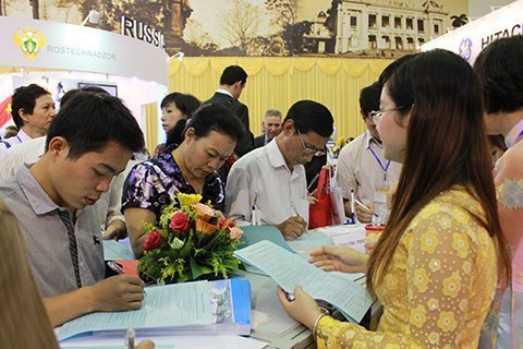 Rất đông người dân tới gian hàng của Việt Nam để tìm hiểu về dự án điện hạt nhân Ninh Thuận. Ảnh: L.V. |