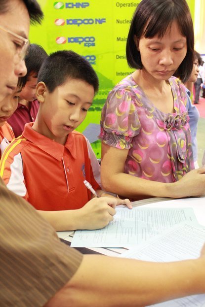 Tham gia khảo sát hiểu biết về điện hạt nhân tại gian hàng Việt Nam. Ảnh: L.V. |