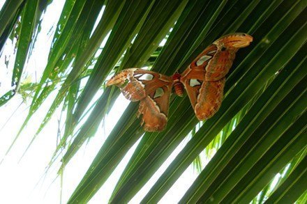 Chị Hợi cho biết, vào trưa nay, trong khi đang chuẩn bị dọn sạch cây dừa thì phát hiện một com bướm khổng lồ, có sải cánh sặc sỡ với nhiều hoa văn trên đôi cánh.