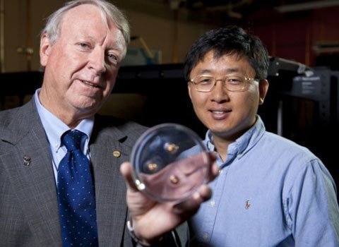 | Hai nhà khoa học đứng đầu nhóm nghiên cứu đến từ Học viện Công nghệ Massachusetts và Đại học Rice bên mẫu siêu vật liệu bắt dính đạn bay trong phòng thí nghiệm. Ảnh: Discovery |
