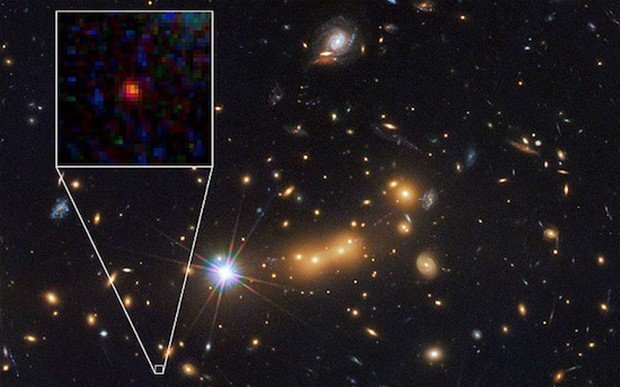 | Thiên hà MACS0647-JD cách Trái đất 13,3 tỷ năm ánh sáng. Ảnh: Telegraph. |