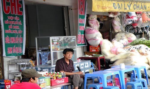 | Một cửa hàng chăn ga gối nệm kết hợp bán chè đỗ đen. |