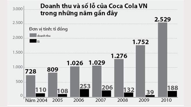 Mới nhất năm 2010, doanh thu của Coca Cola Việt Nam lên đến 2.529 tỷ đồng nhưng chi phí lại lên đến 2.717 tỷ đồng, dẫn đến số lỗ 188 tỷ đồng. Lũy kế đến nay công ty này đã lỗ tổng cộng 3.768 tỷ đồng, vượt cả số vốn đầu tư ban đầu là 2.950 tỷ đồng.