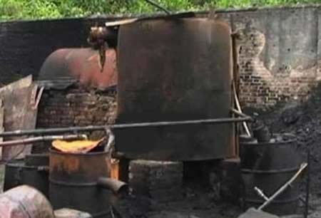 Thấy người lạ, đám nhân công nhìn chúng tôi với vẻ nghi ngờ, dè chừng. Những ánh mắt liên láo như muốn tấn công, đuổi chúng tôi ra khỏi lò nấu dầu. Quá trình tái chế dầu ăn nơi đây thật đơn giản. Các “đầu nậu” sau khi mang dầu về lò, dầu được để nguyên trong thùng phuy và các can nhựa. Tại đây, dầu được đổ vào một bể chứa bằng inox chừng 500 lít, sau đó được đun sôi. Sau khi được đun sôi, gã thanh niên kéo chiếc ống dẫn bằng nhựa lấm lem bùn đất thọc vào chiếc bình chứa dầu và bơm dầu ra một bể chứa lộ thiên bên cạnh. Tiếp đó, một thanh niên vác những tải bột màu trắng đổ vào bể chứa dầu, một thanh niên khác cầm cây tre dài chừng 5m khuấy đều trong bể chứa dầu nóng có màu vàng đục đang sôi sùng sục và bốc hơi ngùn ngụt để lượng bột đổ vào được tan đi. Trung bình, một bể chứa dầu dung tích 500 lít sẽ được pha chế với 2 bao tải chất bột màu trắng (mỗi bao 50kg).