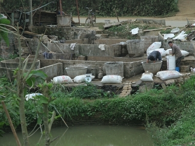 Ngay bên cạnh là 6-7 chiếc bồn xi măng được quây tròn dùng làm bể lọc, bể nào cũng cáu bẩn loang lổ vết bột. Dưới nền lõng bõng nước thải bốc mùi chua. Tại một góc trong cùng là dăm người thợ đang lúi húi bó từng bó miến thành phẩm ngay trên nền đất.