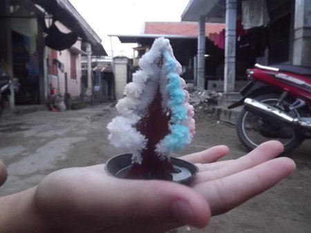 Cụ thể, trong gói nylon gồm có 2 mảnh giấy (đã được tẩm hóa chất và phẩm màu công nghiệp) cắt theo hình tán cây thông, một chân đế bằng nhựa và một gói dung dịch trong suốt, hơi nhờn. Người mua chỉ cần ghép 2 mảnh giấy lại và đặt lên chân đế để tạo hình cây thông, dùng gói dung dịch tưới lên thân cây rồi đem phơi nắng, chỉ hơn 1 giờ sau, toàn thân cây thông giấy kết tủa màu trắng giống như tuyết, phần đầu các tán cây hiện lên nhiều màu rực rỡ (do phẩm màu công nghiệp tạo nên).