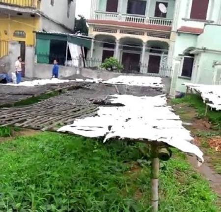 Theo ghi nhận, nhiều nơi chế biến bì lợn không được cách ly, chỉ là sân giếng hoặc sàn nhà của gia đình, nước chảy lênh láng và vô số thứ rác rưởi nằm trên đó. Những đống bì lợn bèo nhèo được thu gom từ nhiều nơi đổ bừa bãi dưới nền đất bẩn thỉu, ẩm ướt.