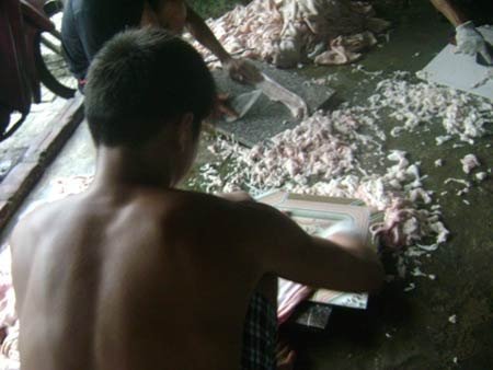 Trong vai khách mua bóng bì, chúng tôi tìm đến nhà ông B., người được giới thiệu là có xưởng sản xuất bóng bì lớn nhất làng. Khu sản xuất bóng bì được bố trí phía sau căn nhà 3 tầng khang của gia đình ông.