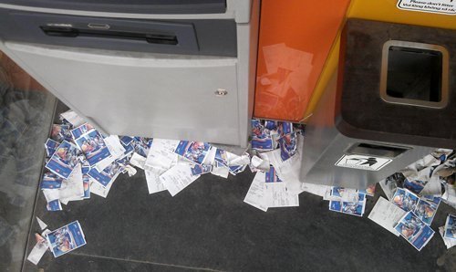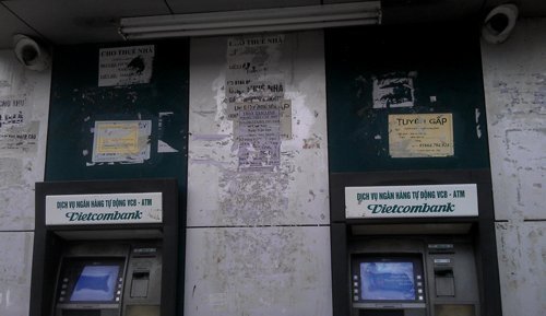 | Nham nhở những tờ giấy quảng cáo. Những cây ATM trở thành nơi quảng cáo miễn phí. Các ngân hàng cho người đi cạy rao vặt không xuể, những mẩu giấy này rất khó bóc |