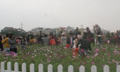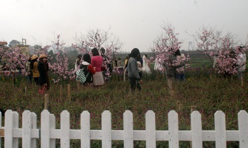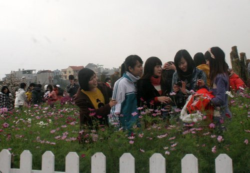 Có mặt tại một vườn hoa cho thuê chụp ảnh, theo quan sát của phóng viên, có tới hàng trăm bạn trẻ đang chen chúc nhau chụp ảnh. Các vườn hoa đều được chủ vườn thiết kế khá ấn tượng với những luống hoa đang nở rộ, tuy nhiên do thời tiết rét đào không nở hoa, hầu hết các cành đào đều là hoa giả.