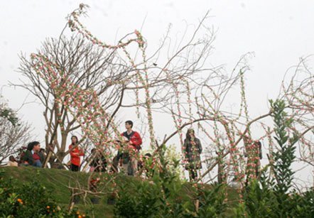 Đào chưa có hoa được gắn hoa giả nhưng vẫn hấp dẫn bạn trẻ làm dáng, chụp ảnh. |