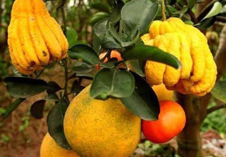 Trong khuôn viên vườn cam rộng chừng vài hecta, vườn cam canh của ông Giáp có lác đác thêm những loại cây rất đặc biệt, vừa có cam, vừa có bưởi lại có phật thủ.