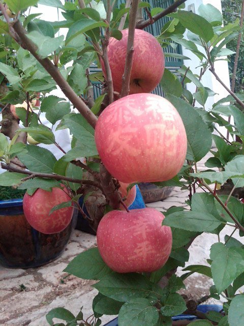 | Cận cảnh chữ in trên quả táo.. Thân của cây táo cảnh dày và có nhiều mấu. Nhiều người cho rằng phải mất ít nhất 2 năm mới trồng được một cây như vậy. |