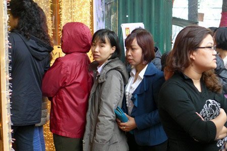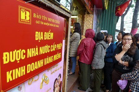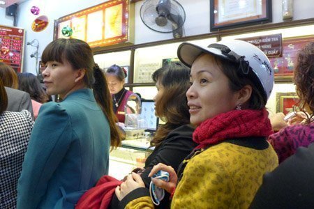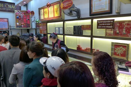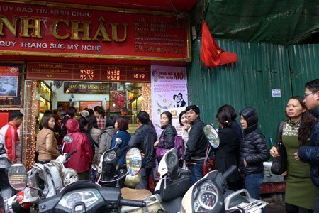 Tại cửa hàng vàng Bảo Tín Minh Châu trên phố Trần Nhân Tông, ngay từ 9 giờ sáng, cửa hàng đã tấp nập khách. Bãi để xe ở trước cử hàng lúc nào cũng chật kín, không còn chỗ trống. Có những lúc, nhiều khách hàng còn phải đứng chờ ở dưới lòng đường cả 10 phút đồng hồ mới tới lượt gửi xe để vào mua vàng vì quá đông khách.