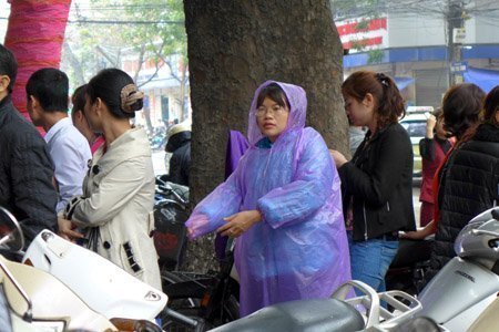 Đến 12h trưa nay, dù trời Hà Nội mưa nặng hạt, dòng người vẫn kiên nhẫn mặc áo mưa đứng xếp hàng để mua vàng, hàng dài người nối đuôi nhau kéo dài sát lòng đường.