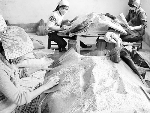 Xã Quảng Phú Cầu (H.Ứng Hòa, Hà Nội) từ lâu được xem là vùng sản xuất tăm nhang lớn nhất miền Bắc. Tại xưởng sản xuất của anh N.V.C (48 tuổi, thôn Xà Cầu, xã Quảng Phú Cầu) lúc nào cũng có hơn chục công nhân làm việc cật lực. Các bó tăm nhang sau khi chẻ bằng máy, nhuộm đỏ bằng phẩm màu, được bó gói cẩn thận xếp chồng lên nhau, để kín lối đi. Đáng chú ý, trong khu vực nhuộm chân tăm nhang luôn có một thùng đựng sẵn nước hóa chất màu đỏ đục, mùi khét và hắc rất khó chịu. Cạnh đó là 2 thùng đựng hóa chất có vỏ màu xanh ghi bằng chữ Trung Quốc. Theo một số thợ làm thuê tại xưởng, họ thường dùng loại hóa chất này trộn với phẩm màu để ngâm tăm nhang.