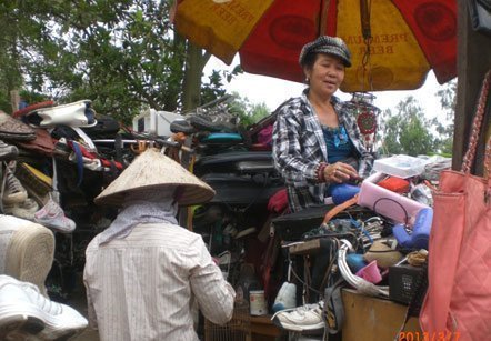 Trên bãi đất trống, bà mướn thêm một chú trông nom, bảo vệ hàng và một cô giúp bà tìm hàng để bán, hoặc thi thoảng đánh bóng đôi giày, làm mới cái túi bán cho khách.