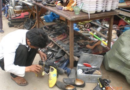 | Chú "giám đốc kỹ thuật kiêm bảo vệ" đang cần mẫn sửa đôi giày cho khách |