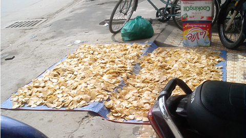 Nhiều chiếu phơi đậu phộng, bánh phồng tôm... bị kiến, ruồi nhặng bu kín. Vài phụ nữ phơi bánh lâu lâu nhoài người ra lượm lại những mẩu bánh bị rơi xuống đường. “Họ phơi cho ráo rồi đem bán ngay bây giờ đấy. Bán không hết cứ việc về luộc lại, rửa sạch, đem phơi rồi đi bán tiếp” - một người bán nước vỉa hè ở đây cho biết.