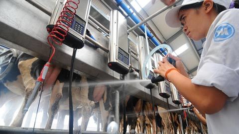 | Vệ sinh cho bò trước khi vào vắt sữa tại trang trại chăn nuôi bò sữa của Vinamilk ở Nghệ An |