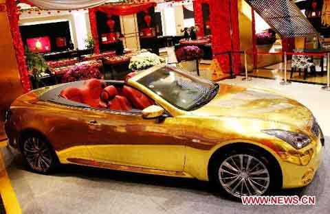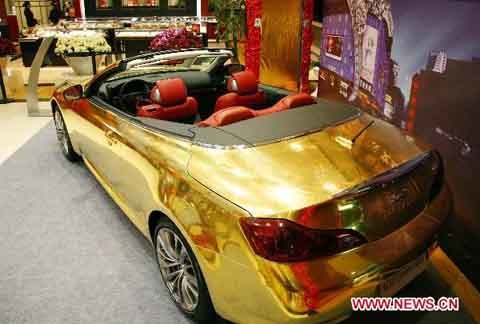 Đó là chiếc xe thể thao Infiniti G37 được phủ bằng vàng 24K. Xe được thiết kế kiểu dáng thể thao với mui trần, có hai cánh cửa và 4 chỗ ngồi. Được biết, những người thợ kim hoàn đã phải mất 4 tháng kỳ công để dát vàng lên nó.