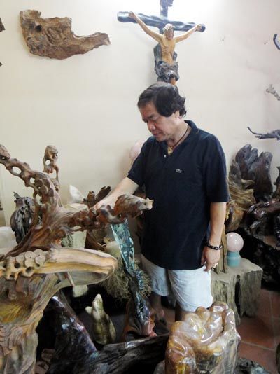 Dù đã được giới thiệu trước nhưng tôi vẫn không khỏi choáng ngợp khi bước vào ngôi nhà của ông trên phố Hoàng Hoa Thám, Hà Nội. Cả căn nhà vẻn vẹn chỉ chừa lại một lối đi nhỏ, còn lại cơ man nào là gỗ. Từ gốc gỗ cao cả mấy mét hình con rồng đến những những vật nhỏ hơn như bể cá, kệ kê ti vi, khay đựng hoa quả, thậm chí đến cái gạt tàn cũng được làm bằng gỗ lũa.