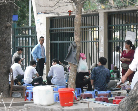 Phố Phủ Doãn, cạnh bệnh viên Việt Đức, tuy có đến cả chục quán cóc bán trà đá, nhưng ngay từ mấy ngày đầu hè này đã luôn quá tải, thậm chí nhiều người không có ghế, sẵn sàng lấy dép kê và ngồi luôn trên nền vỉa hè.