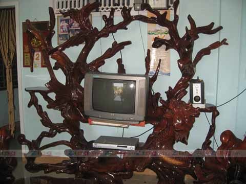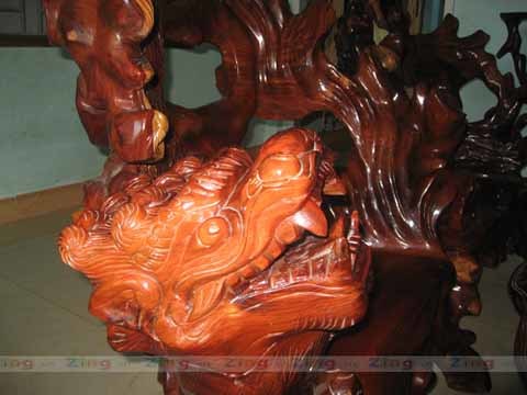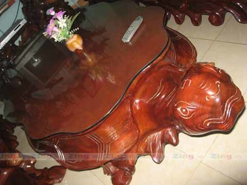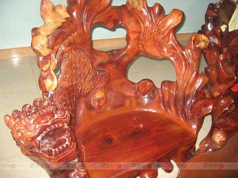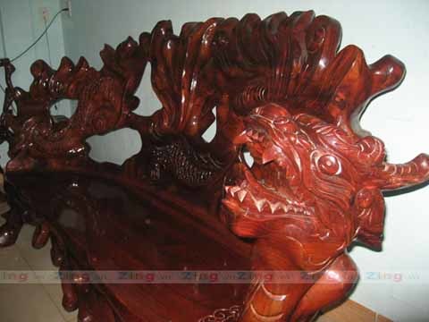 Bộ bàn ghế gồm đầy đủ hình dáng long, lân, quy, phụng được làm từ gốc cây cẩm lai (chi gỗ quý còn có tên khác là sưa, trắc). Theo vị chủ nhân thì gốc rễ gỗ quý khổng lồ để làm bộ bàn ghế này được mua về từ Campuchia vào thập niên 90 của thế kỷ trước.