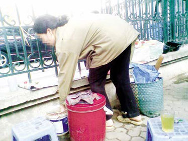 Ở những quán cóc kiểu này, người ta cũng chỉ cần một xô nước nhỏ để vệ sinh những chiếc cốc sau khi khách uống. Mỗi khi khách đứng dậy trả tiền, chủ quán liền lấy cốc nhúng qua xô nước rồi lại úp vào khay. Một ngày đến hàng chục, có khi đến hàng trăm cái miệng ngậm vào một chiếc cốc nhưng cũng chỉ có từng ấy động tác và cũng chỉ có chừng ấy nước để rửa. Đó là còn chưa kể, chủ quán còn dùng khăn lau bàn để lau cốc chén.