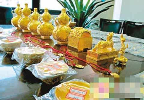 | Vàng và đồ trang sức trị giá tới 6 triệu NDT (tương đương 19,2 tỷ đồng) bày la liệt trên bàn. |