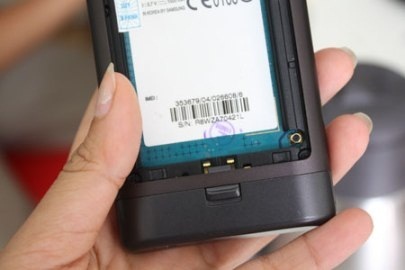 | Chiếc điện thoại Samsung made by Korea này thực chất là hàng "dựng" vì có dấu nhỏ màu tím đóng giữa main và phần lưng máy. (Ảnh: Nhật Nam) |