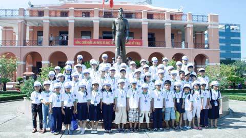 | Các em học sinh nhận học bổng thăm quan bến Nhà Rồng. |