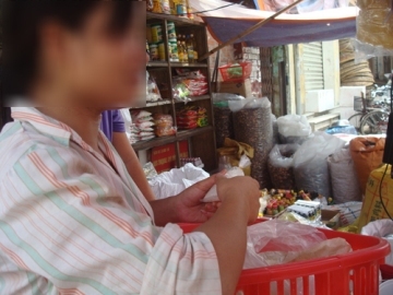 Chị chủ quầy cũng quảng cáo thêm: "Hiện nay, loại này được nhiều người lựa chọn hơn các dạng bột và loại viên nhỏ vì nó dễ chế biến". Ngay sau đó, chị N.Hạnh chọn 1 túi 500g dạng B1 và 100g loại hạt hình thoi màu trắng trong. Theo quan sát của PV, cả 2 loại đường chị N.Hạnh vừa chọn đều không có nhãn mác, địa chỉ cụ thể. Khi PV hỏi thêm về chất lượng các loại đường này, chị chủ quầy cho biết: "Cứ yên tâm mà dùng. Nếu không hài lòng mang lại đây, tôi đền cho cái khác".
