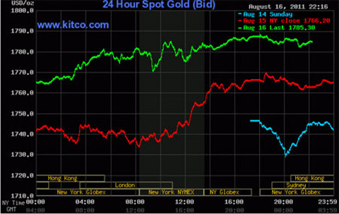 Đầu giờ sáng nay, mở cửa phiên châu Á, vàng giao ngay có lúc vọt lên 1.787 USD/ounce, tuy nhiên sau đó giảm nhẹ và hiện đang giao dịch quanh mức 1.785 USD/ounce.